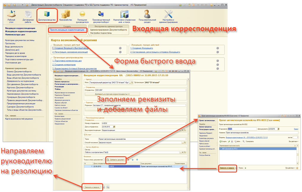 Для быстрого ввода входящего предусмотрена упрощенная форма, для которой предусмотрен минимальный набор реквизитов. Дальнейшая работа с входящим продолжается в полной карточкой и позволяет продолжить его обработку.