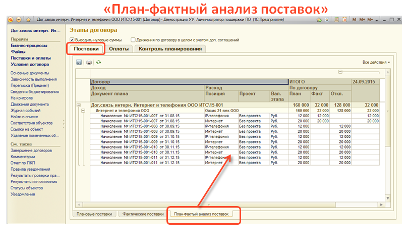 Отчет "План-фактный анализ поставок" доступен пользователю на соответствующей вкладке: