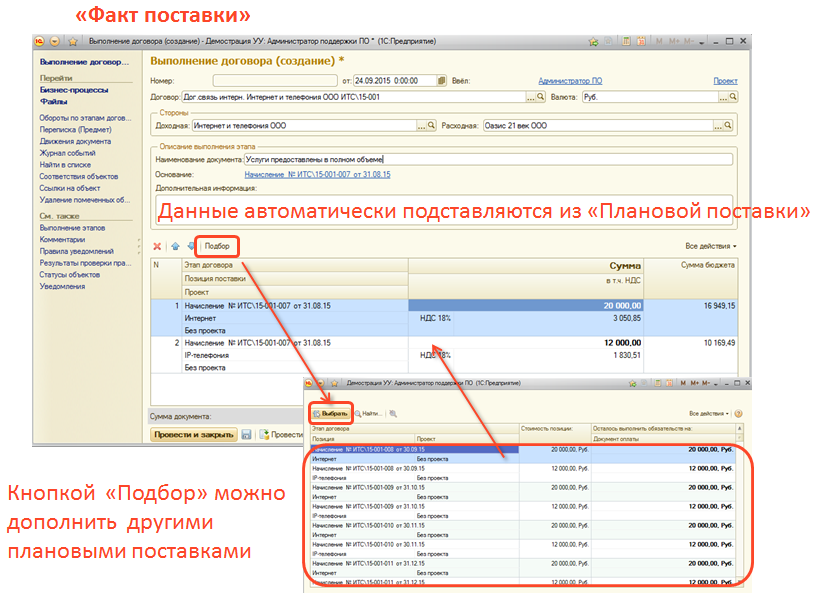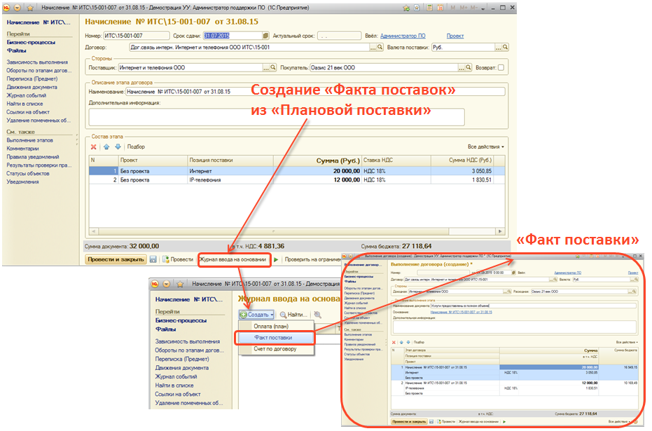 Способ 2. Открываем плановую поставку, далее переходим в "Журнал ввода на основании" и создаем "Факт поставки".