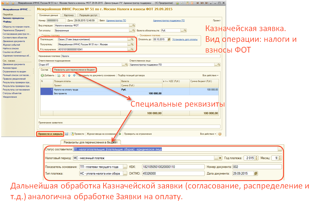 Казначейская заявка на оплату налогов и взносов ФОТ