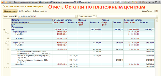 - Остатки по платежным центрам;