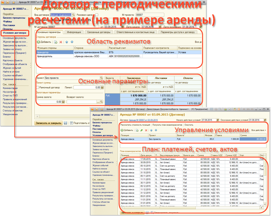 Карточку договора необходимо заполнить соответствующими данными: выбрать вид договора, сроки, стороны договора, ответственных.