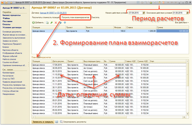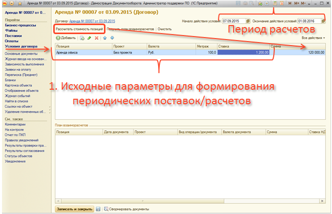 Для планирования обязательств необходимо перейти в "Условия договора" для рассчета сумм.