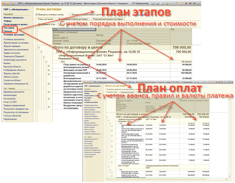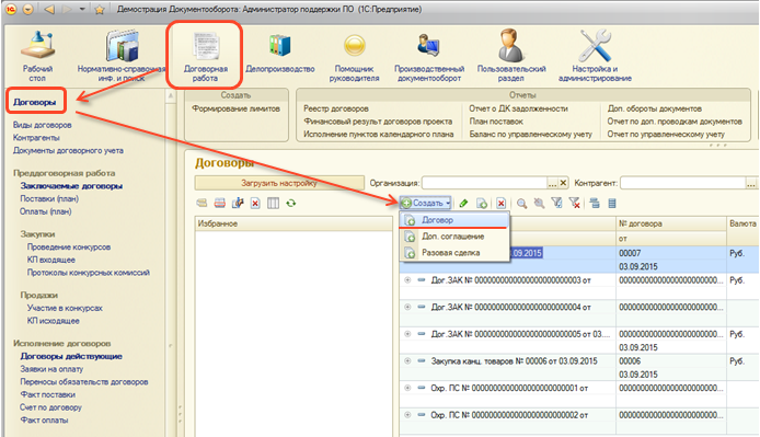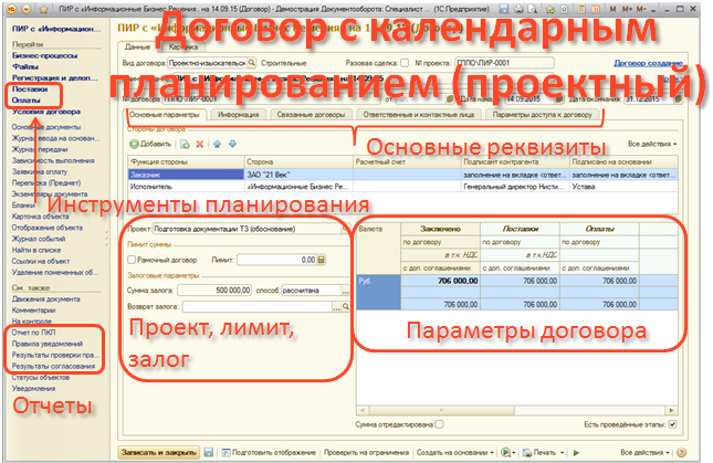 Данный вид договора предназначен для управления обязательствами в рамках созданного календарного плана поставок и платежей. Карточка договора создается из раздела "Договорная работа":