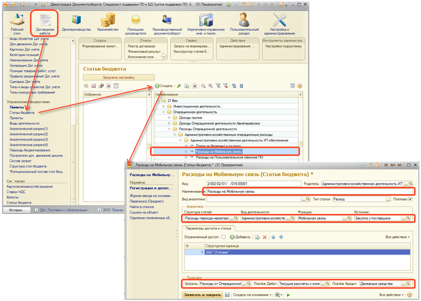 Ввод бюджетных статей доступен пользователю из раздела "Статьи бюджета" подсистемы "Договорная работа". Примечание. Данный механизм является элементом подсистемы "Бюджетировние".